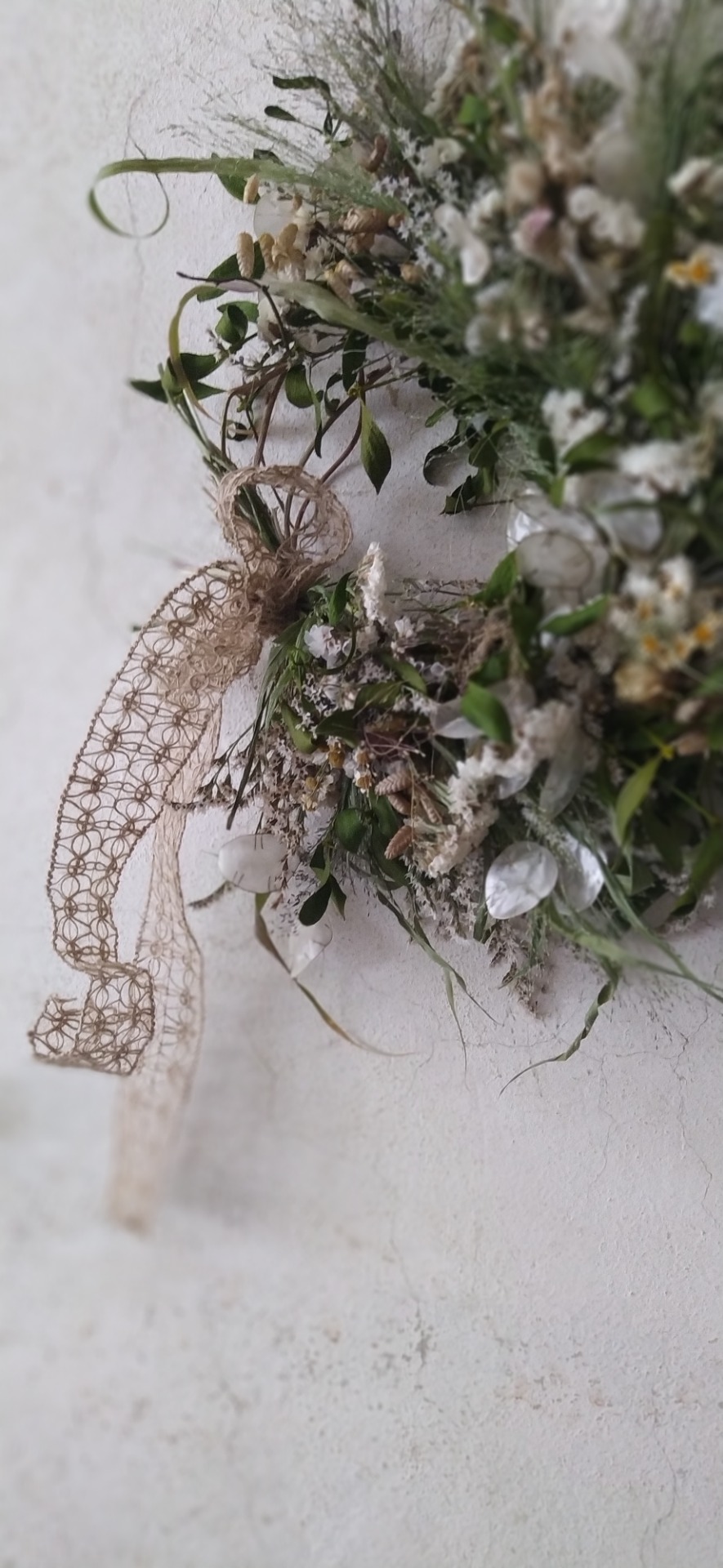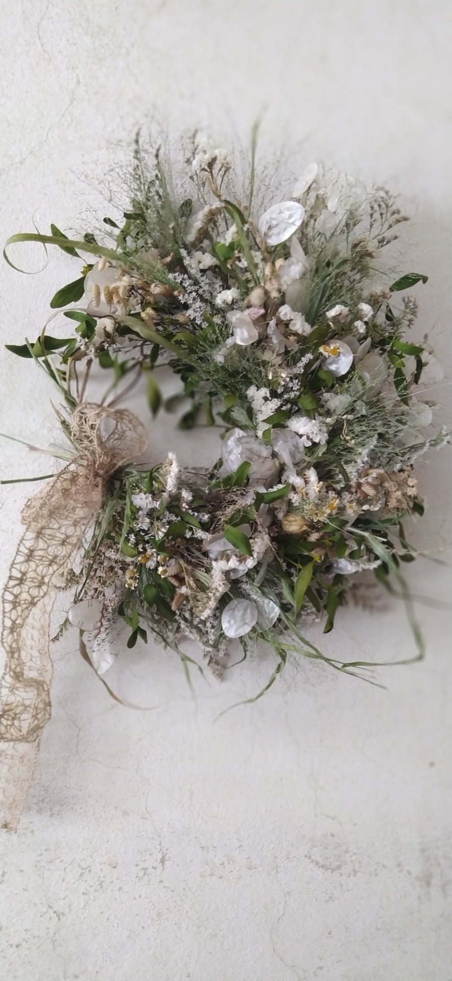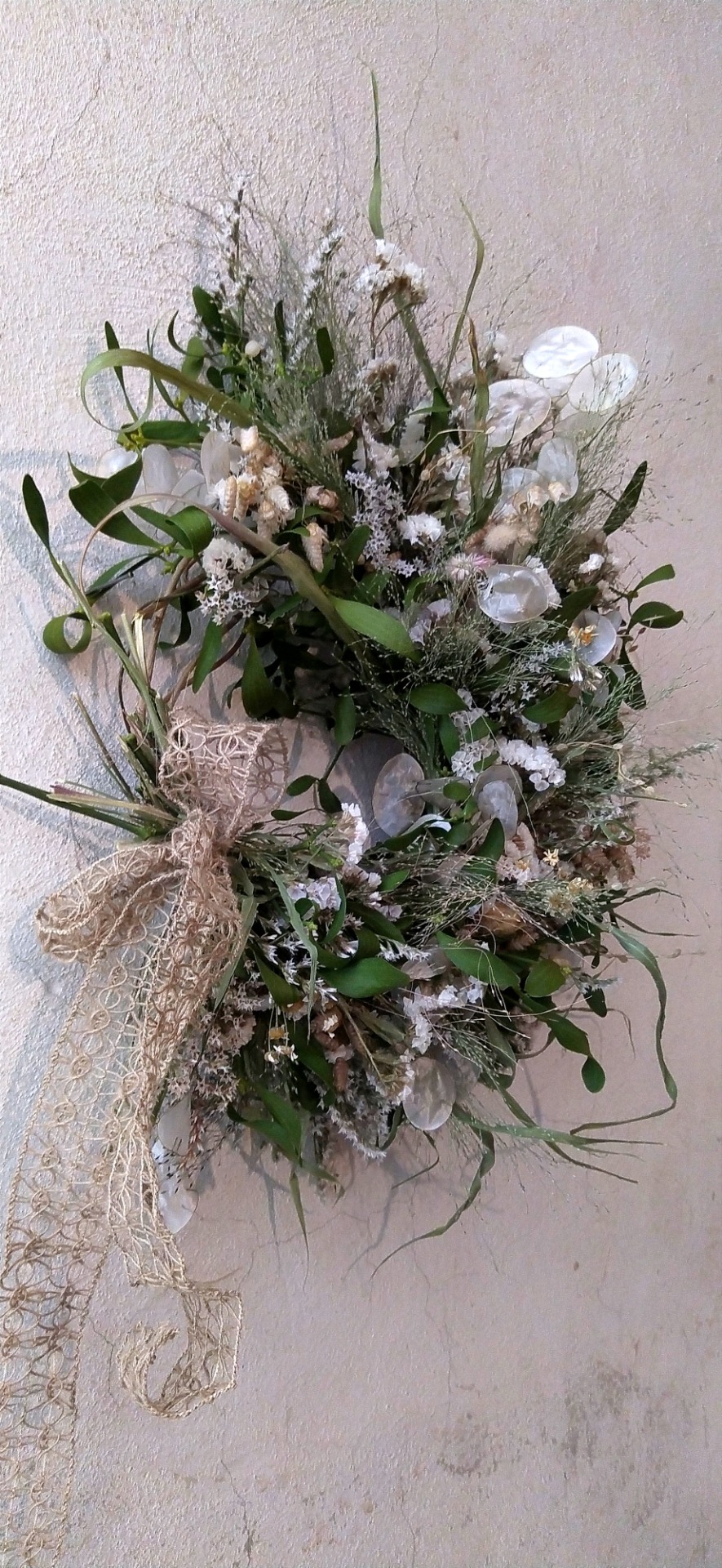 Tak trochu jak od zimní víly. Plný a přesto jemný Polo-věnec se lněnou mašlí.. ideální pro interiér, venku jej mějte krytý před deštěm, ať vydrží pár měsíců.